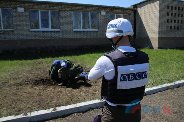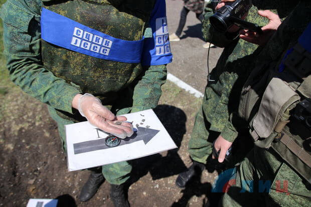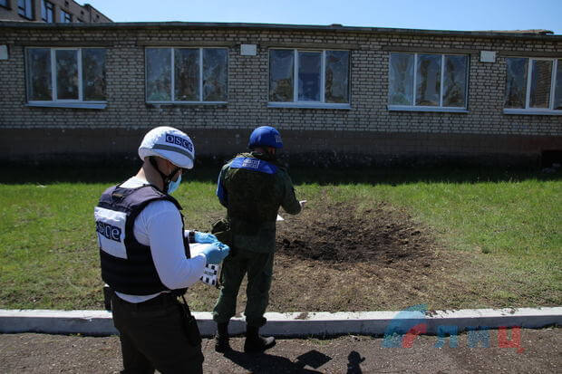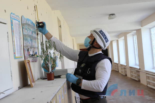 Наблюдатели мониторинговой миссии зафиксировали повреждения, замеряли диаметры воронок, провели фотофиксацию, однако не стали общаться с очевидцами обстрела, в том числе с директором школы, поврежденной обстрелом.